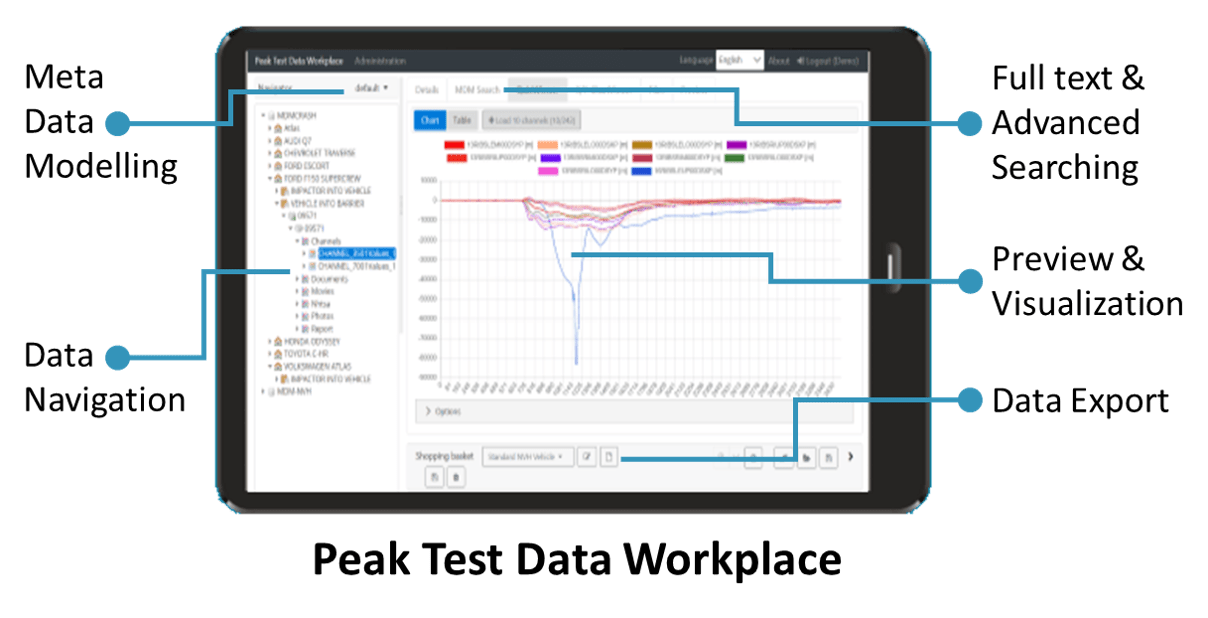Der Peak Test Data Workplace bietet Möglichkeiten zur interaktiven Bearbeitung Ihrer Datenkataloge. Darüber hinaus können Sie mit dem Testdatenmodellierer des Peak Test Data Workplace interaktiv Metadatenmodelle und Metadatenvorlagen für die Beschreibung und Kommentierung verschiedener Testtypen definieren. Damit können Sie unser Testdatenmanagementsystem in einer Vielzahl von Anwendungsbereichen einsetzen, wie z.B. für die Speicherung von Akustik- und Motortests, Abgasmessungen, Crash-Messungen und die Verwaltung von Simulationsparametern, Fahrszenarien (Fahrzeugsimulation) und Busdaten.