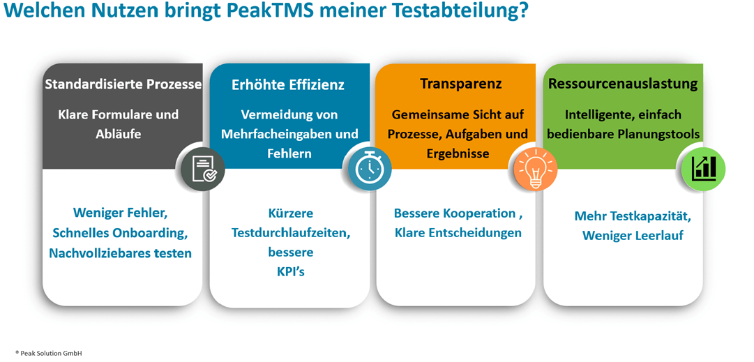 Mit der Peak Test Management Suite (PeakTMS) heben Sie Ihr Testmanagement auf ein neues Niveau und profitieren von folgenden Vorteilen: