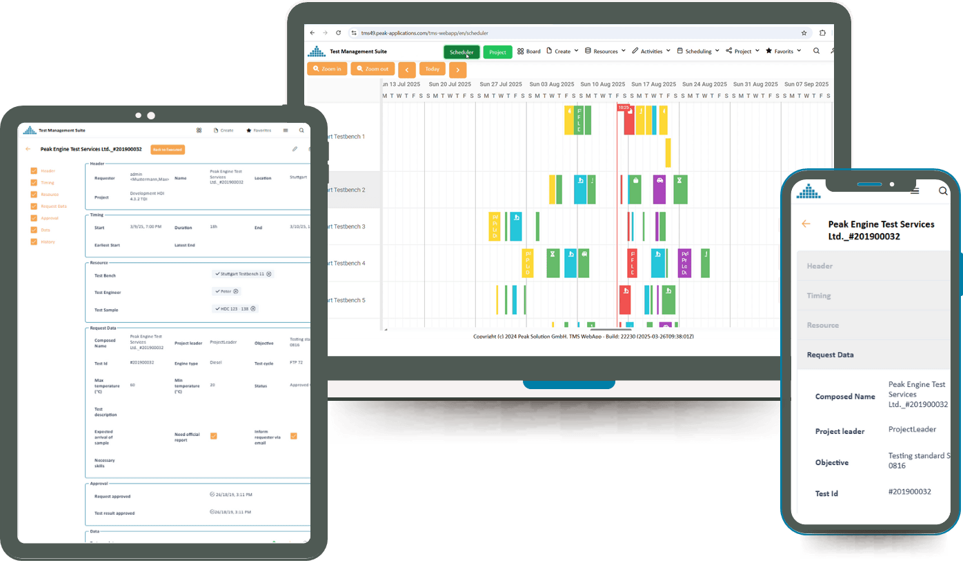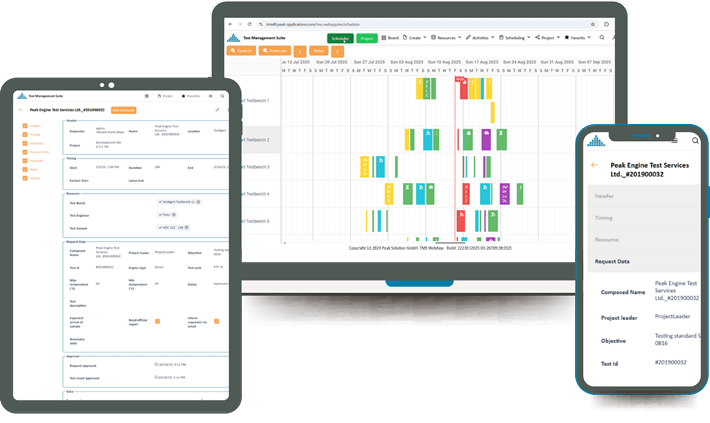 Die Peak Test Management Suite (PeakTMS) ermöglicht Ihnen die Erstellung und Planung aller Aktivitäten und Ressourcen in Ihrer Testumgebung. Basierend auf Vorlagen (No-Code) und Geschäftsregeln (Low-Code) unterstützt Sie unser Testlabor-Managementsystem bei der Beschreibung, Inbetriebnahme und Verwaltung von Testprojekten und Testanforderungen sowie bei der Beschreibung aller Prozesse Ihres Testlabors.