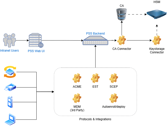 - Integration of Certificate Authorities (CAs): PSS supports numerous CAs, including Microsoft CA and OpenXPKI, and enables their active or passive integration.