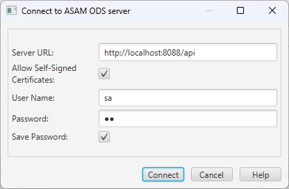 Connect to your ASAM ODS server by providing the server URL, user name and password.
