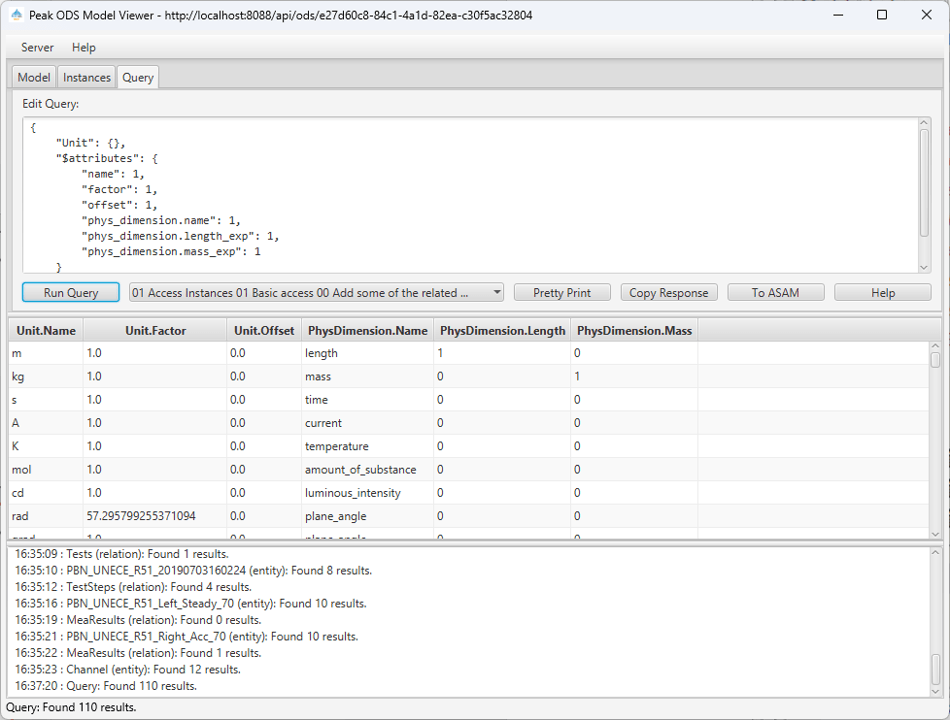 The Peak ODS Model Viewer is a free tool that allows you to interactively inspect and validate the data model and content of your Peak ODS server or any other ASAM ODS server. You can also use it to familiarize yourself with ASAM ODS database queries using JAQueL.