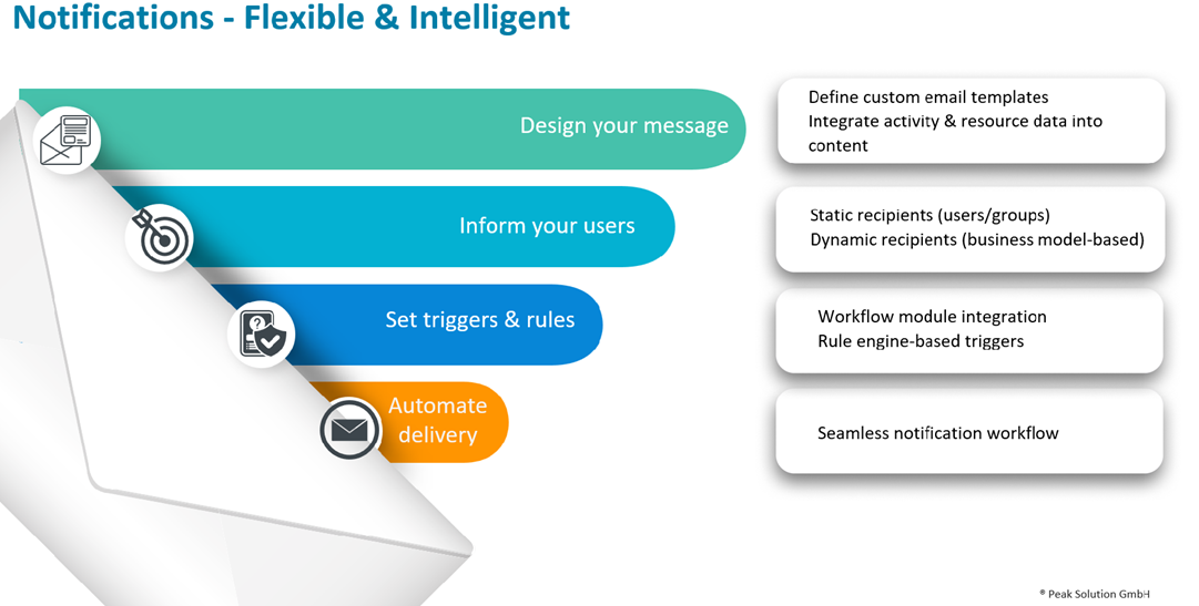 PeakTMS includes customizable email notification components. Participants can thus be automatically informed of various events in the testing process. Email templates help you define the events for notification, as well as the content and recipients. All information defined in the tests can also be directly retrieved in the template, ensuring that all necessary and desired information is provided to the participants in the process directly in the emails.