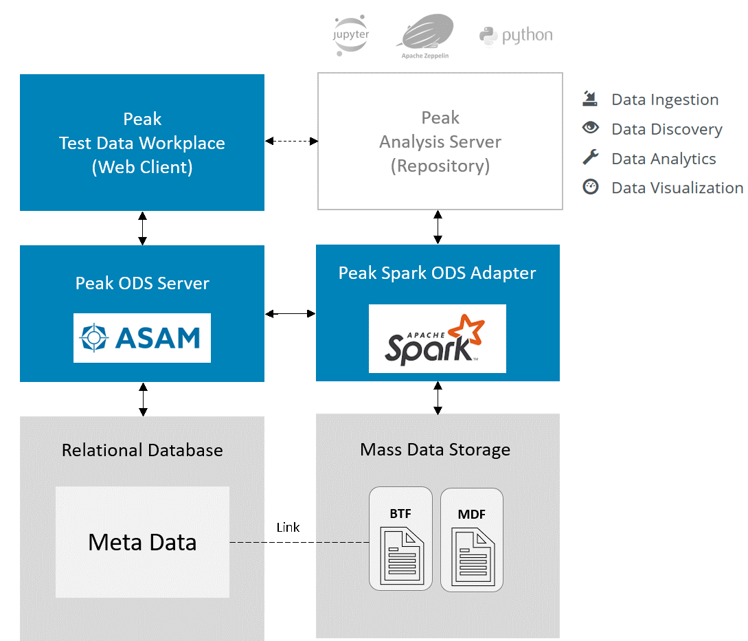 Peak ODS Adapter for Apache Spark integrates seamlessly with ASAM ODS, enabling users to access both instance and mass data directly using Apache Spark SQL and DataFrames. This capability complements the interactive experience of Peak Test Data Workplace web client by allowing developers and data analysts to programmatically execute complex, custom queries. With Apache Spark’s high-level APIs, like Python, data professionals can leverage tools like Apache Zeppelin or Jupyter Notebooks for in-depth, interactive data exploration.
