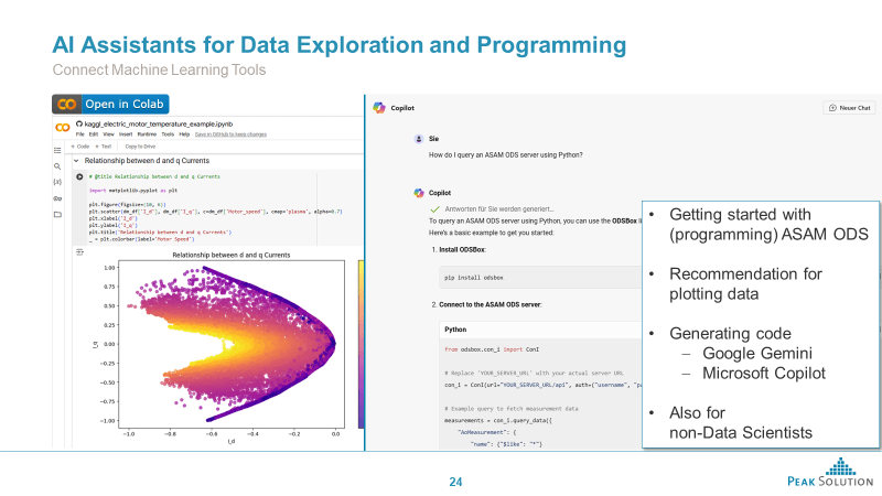 As a conclusion one can say that the Data Management technology components of ASAM ODS support the general requirements for Machine Learning. In combination with Open Source software such as ASAM ODSBox, typical Python Machine Learning Tools and Analysis Libraries can be used by Data Scientists. Furthermore, ASAM ODSBox also bridges the gap to Microsoft Copilot, Google Gemini or other AI Agents to create solutions faster and more efficient – even for non-Data Scientists.