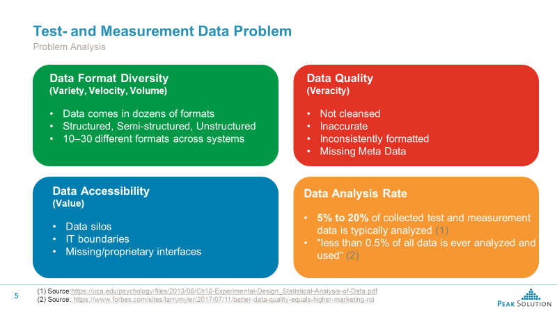 Looking from the problem perspective, the test and measurement data problem is not new and was already recognized during the Big Data era as the Five Vs: Variety, Velocity, Volume, Veracity and Value and can be grouped into three data problem classes: